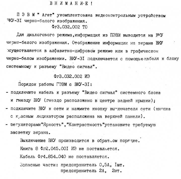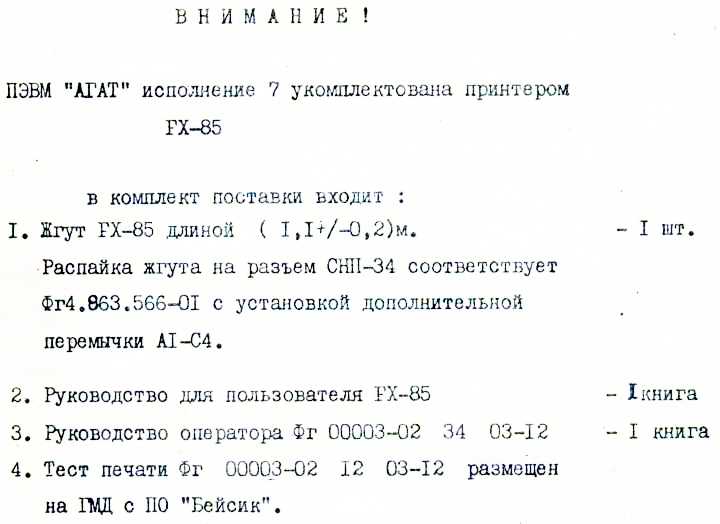 В комплект Агат-7 входило 8 книг. Кроме того, иногда поставлялись листы (каждый в отдельной картонной обложке) под названием "Дополнение к техническому описанию и инструкции по эксплуатации". На листах была дополнительная информация, в основном по комплектации.