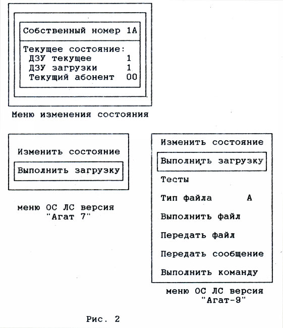 Операционная система локальной сети (ОС ЛС) позволяет объединить в единую систему до 128 ПЭВМ "Агат" (протяжённость до 3 км). При этом на подключённых к сети ПЭВМ обеспечивается одновременное независимое функционирование различных систем программирования и прикладных программ. Все ПЭВМ, одновременно работающие в сети, могут находиться в режиме главной или терминальной. Главная - это ПЭВМ, находящаяся в режиме, который обеспечивает возможности загрузки с неё других ПЭВМ и доступа загруженных ранее ПЭВМ к её дисковым запоминающим устройствам (ДЗУ). ПЭВМ, находящаяся в режиме терминальной, - это ПЭВМ, на которую загружена система программирования или прикладная программа с главной ПЭВМ и которая может использовать ДЗУ главной ПЭВМ. ОС ЛС допускает одновременное функционирование в сети нескольких главных ПЭВМ. Допускаются также переходы из режима главной ПЭВМ в режим терминальной и обратно.