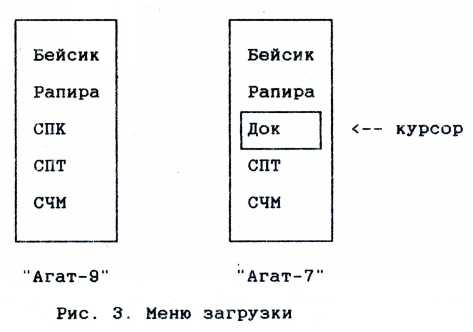 Для выполнения загрузки терминальных ПЭВМ необходимо выбрать в меню ОС ЛС пункт "Выполнить загрузку", в следующем меню выбрать необходимую систему (см. рис.3) и указать номера загружаемых терминальных ПЭВМ. При этом в ДЗУ, номер которого указан "ДЗУ загрузки", должен быть установлен системный диск. Для загрузки СП Бейсик, СП Рапира, СП Ассемблера в Агате в качестве системного диска могут быть использованы диски ИКП1 или загрузочная дискета ОС ЛС. Для загрузки систем СПТ и СЧМ используется дискета КПОН (Фг.00032-01 12 01). Для загрузки "Агата-7" используется дискета ОС ЛС.