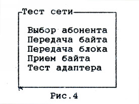 Для запуска программы необходимо загрузить СПК и выйти в меню работы по сети, а затем в пункт "Проверка модуля сети". В результате этих действий тест загрузится в память и появится основное меню теста проверки функционирования локальной сети, имеющее вид (рис.4):