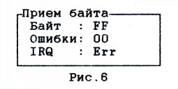Сообщение "Байт" - это байт, принятый в середине информационного пакета. Сообщение "Ошибки" - суммарное количество ошибок за сеанс приёма. Надпись "IRQ: Err" означает, что прерывания не идут, a "IRQ: Ok!" - прерывания идут. После этого экран очищается, и, если нет обрыва в линии связи, закрашивается разноцветными вертикальными линиями. После заполнения всего экрана снова появляется сообщение (рис.6) и процесс приёма повторяется. Если ПЭВМ в течение 20 с не закрашивает экран ВКУ вертикальными линиями разного цвета, то это означает обрыв в линии или неисправность модуля локальной сети. В этом случае необходимо нажать одновременно клавиши "Упр"/"Сбр". Если принят информационный пакет, содержащий 00, это означает конец сеанса приёма, и на экране ВКУ появляется сообщение об этом. Нажмите клавишу "ПРОБЕЛ" для выхода в меню теста. Для возврата в меню теста в процессе приёма нажмите "Ред". Для выхода из теста необходимо нажать клавишу "РЕД", находясь в основном меню теста.