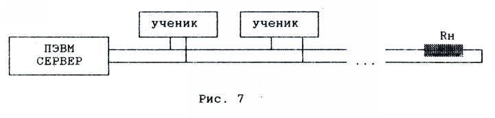 Тип сети - моноканал. Для соединения ПЭВМ на малых расстояниях используется телефонный или аналогичный ему кабель, а на больших - коаксиальный. В конце линии устанавливается нагрузочное сопротивление 100 Ом, 0,5 Вт (см. рис. 7). Проверять правильность включения ПЭВМ следует поочерёдно. Если очередная ПЭВМ не загружается, то поменяйте местами соединительные провода. Характерным признаком неправильного включения является ошибка при загрузке.