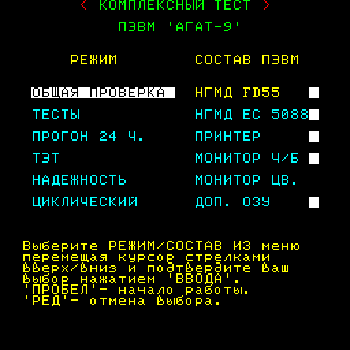 Комплексный тест (Фг.00033-01 12 01) проверки ПЭВМ "АГАТ" исполнения 9 в заводских условиях и при последующей эксплуатации.